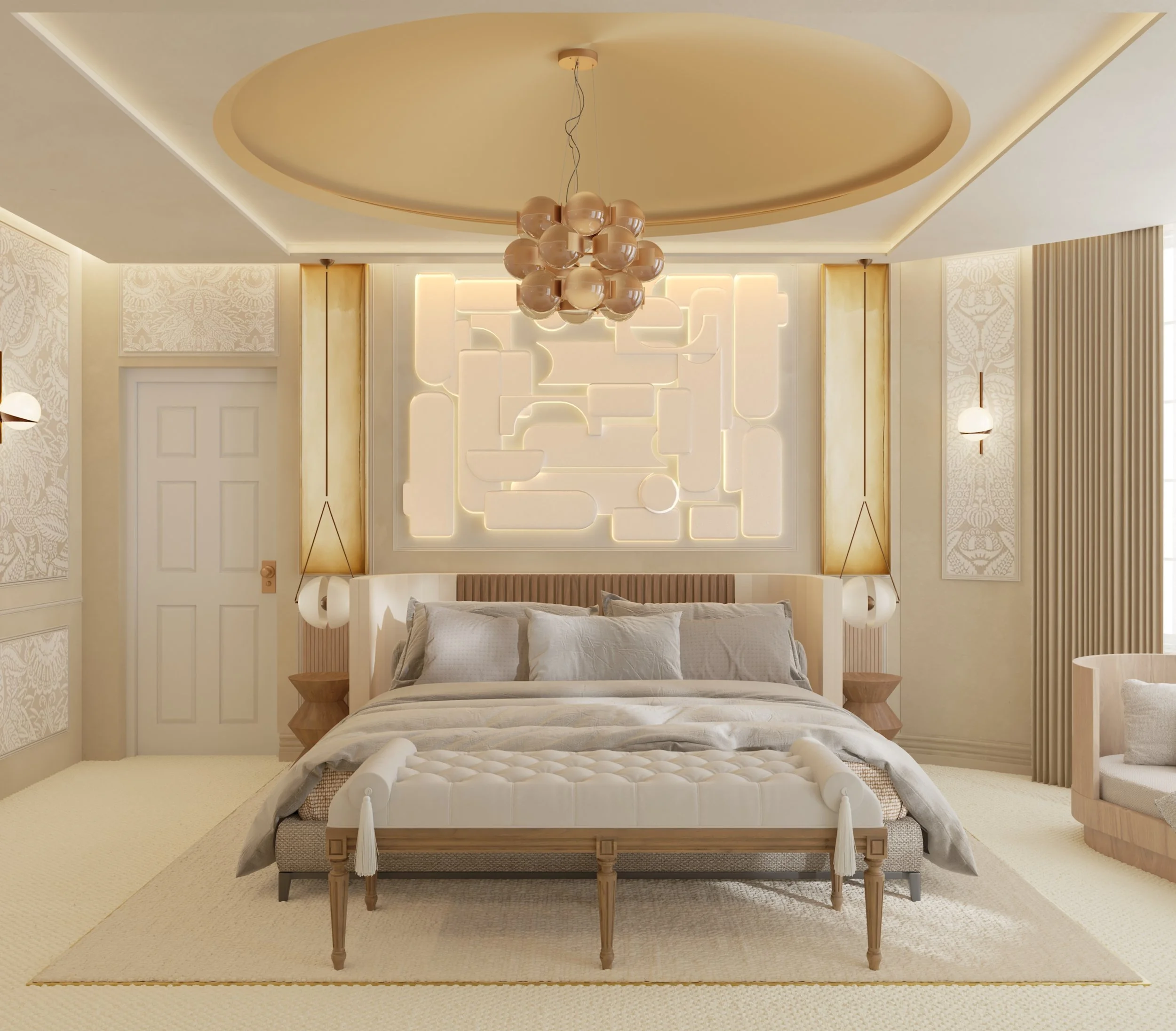 Material selection and detailing were treated as architectural devices in their own right. A restrained palette, layered textures, and crafted joinery establish a quiet luxury that reveals itself over time. Wellness and comfort were integral to the brief, informing both the spatial layout and the atmosphere of the interiors.